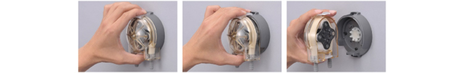 Das Gehäuse kann ohne Verwendung von Werkzeug einfach demontiert und montiert werden. So kann beispielsweise ein Schlauchwechsel schnell durchgeführt werden.